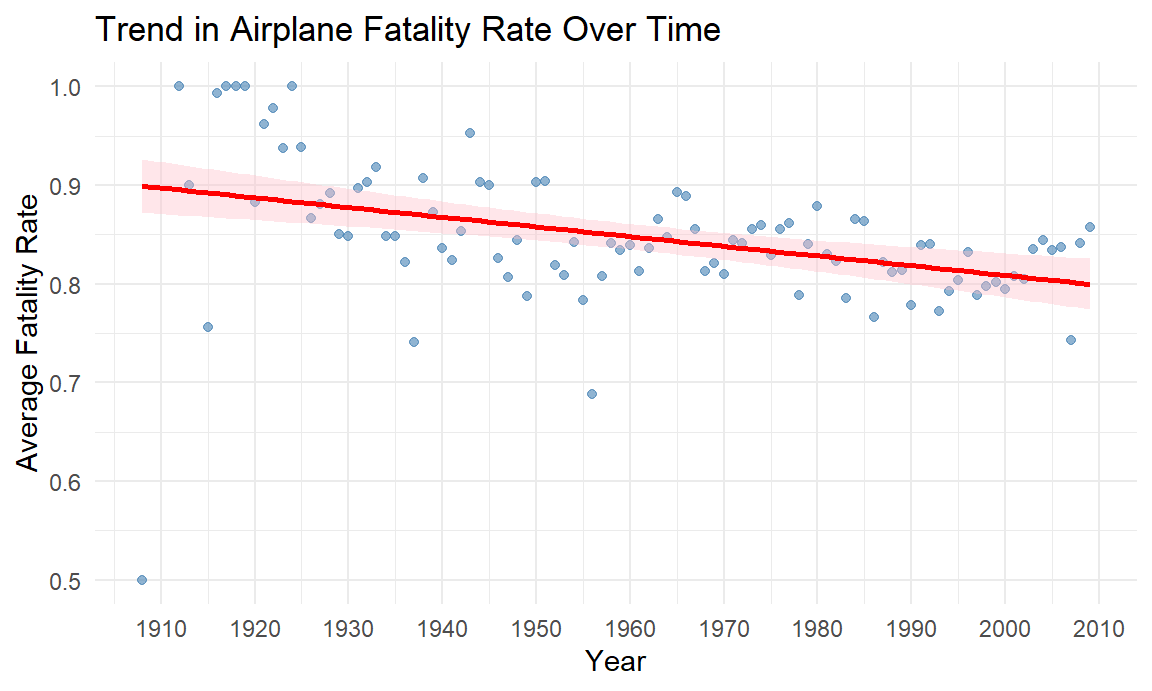 title = "Trend in Airplane Fatality Rate Over Time",,
