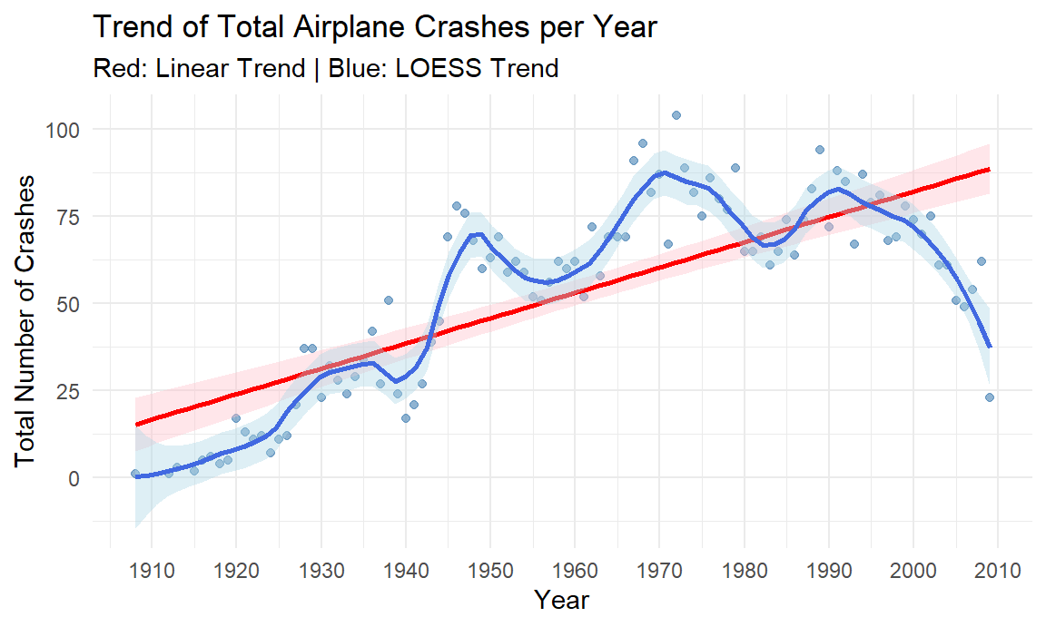 To describe the historical trend of aviation safety, we aggregated the total number of crashes per year. We then fitted a simple linear regression model and Loess model to determine if there was a statistically significant linear increase or decrease in crash frequency over the recorded time period (1908–2009). With a medium fitted model, the linear regression analysis revealed a statistically significant upward trend.But this failed to accurately describe the crash events overtime, LOESS could reveal more specific fluctuations and details in history.