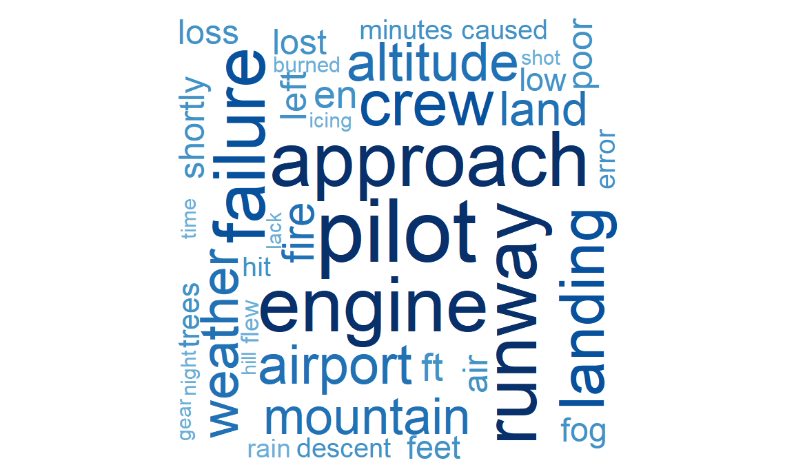 To see the causes and recurring themes of aviation incidents, we performed text mining on the crash summary descriptions. After tokenizing the text and removing common stop words (e.g., ‘the’, ‘and’,“plane”,“crashed”) and numbers, we generated a Word Cloud.