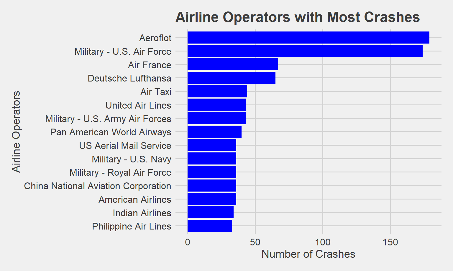 Aeroflot, the largest airline in Russia, is by far the commercial airline with the greatest crashes at 187 total crashes. The U.S. Air Force, a military airline, comes in close second at 182 total crashes.