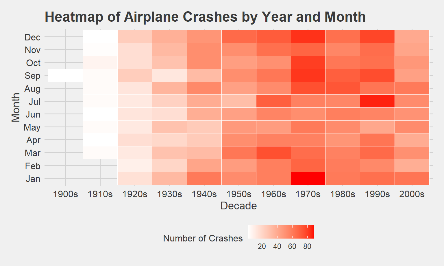 Based on this map, the 1970s, particularly the January, December, October, September, and August months have especially high numbers of crashes compared to other decades and months. July in the 1990s, also had a particularly high number of crashes, indicated by the darker red color. The monthly and seasonal trends will be looked at in more detail using ANOVA.